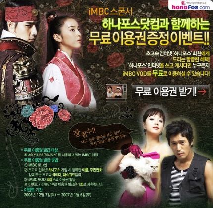 Ãʰí¼ÓÀÎÅÍ³Ý ÇϳªÆ÷½º¸¦ ÀÌ¿ëÇÏ´Â iMBC ȸ¿øµéÀÇ °æ¿ì °£´ÜÇÑ ÀÎÁõÀýÂ÷¸¸ °ÅÄ¡¸é iMBC »çÀÌÆ®(hanafos.imbc.com)¸¦ ÅëÇØ VOD 3ÀÏ ¹«·á ÀÌ¿ë±ÇÀ» ¹ÞÀ» ¼ö ÀÖ´Ù. ±â°£Àº 2007³â 1¿ù 6ÀϱîÁö °è¼ÓµÇ¸ç, ¹ß±ÞÀ» ¿øÇÏ´Â ÇϳªÆ÷½º °í°´ ¼±Âø¼ø 10¸¸¸íÀ» ´ë»óÀ¸·Î 1ȸ¿¡ ÇÑÇØ Áö±ÞµÈ´Ù.